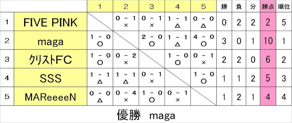 結果第31回 MIXナイターフットサルが行われ、初出場1チーム含む5チームが参加してくれました。 |